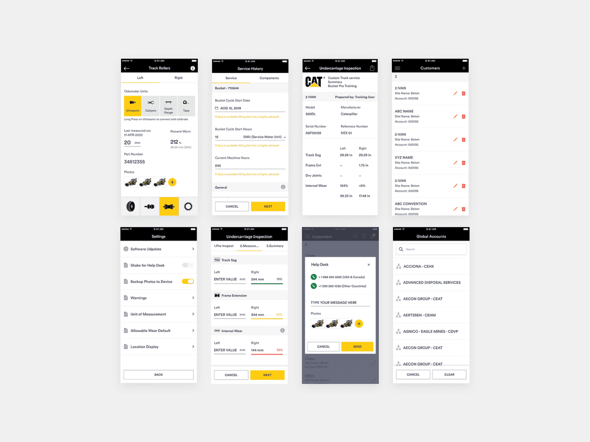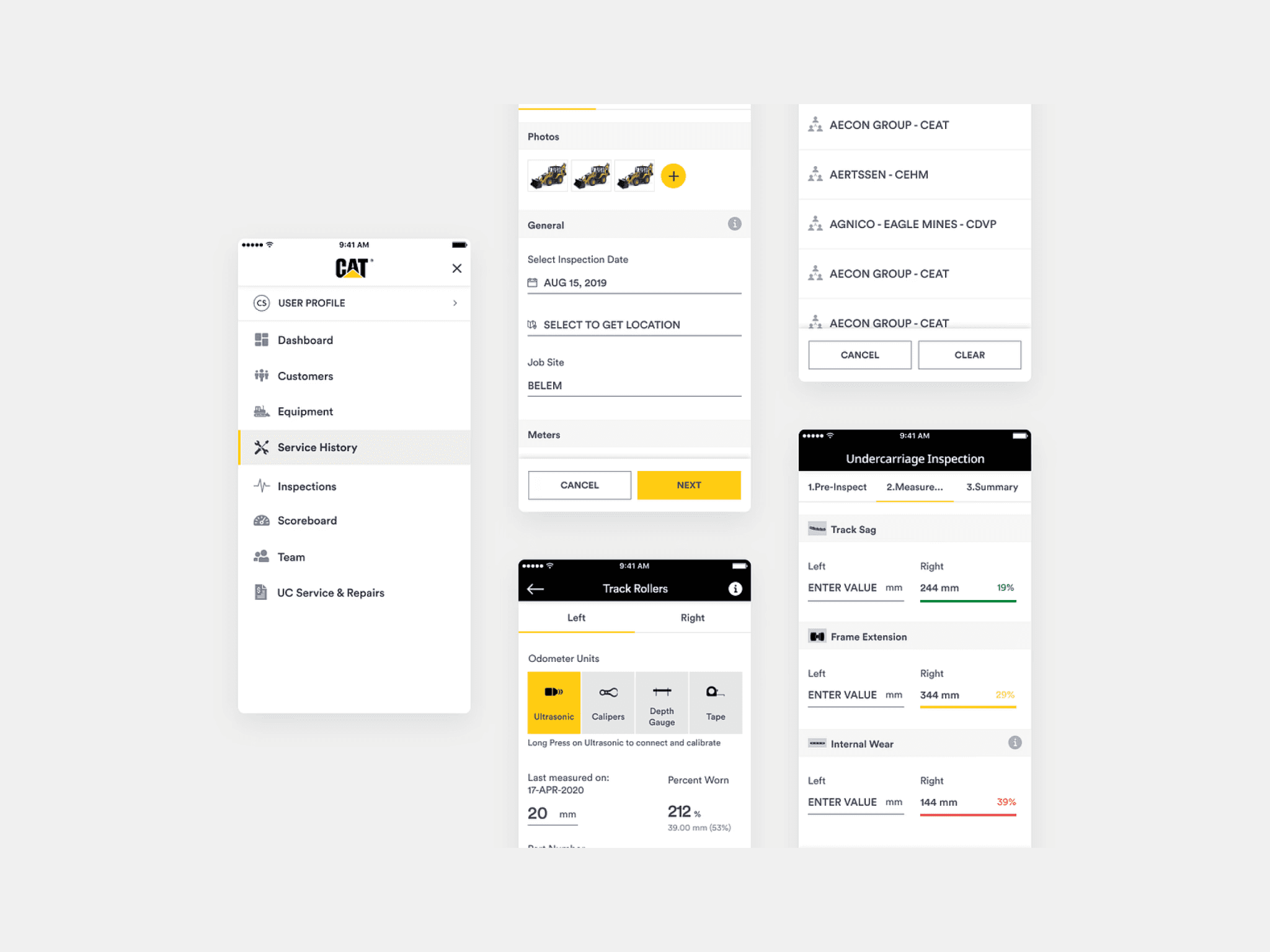Given the on-site nature of the users' work environment, particular emphasis was placed on visibility. Large icons, bold text, and a contrast-rich color palette ensured that the app remained usable even under the bright sun. To facilitate quicker data entry, dropdown menus, sliders, and toggle switches were integrated. These not only accelerated the process but also minimized potential errors, ensuring accurate wear and tear readings. Considering the varied range of mobile devices used by Caterpillar's workforce, the design had to be fluid. Each element was crafted to adapt seamlessly to different screen sizes, ensuring every user, regardless of their device, experienced the app's full functionality without compromise.