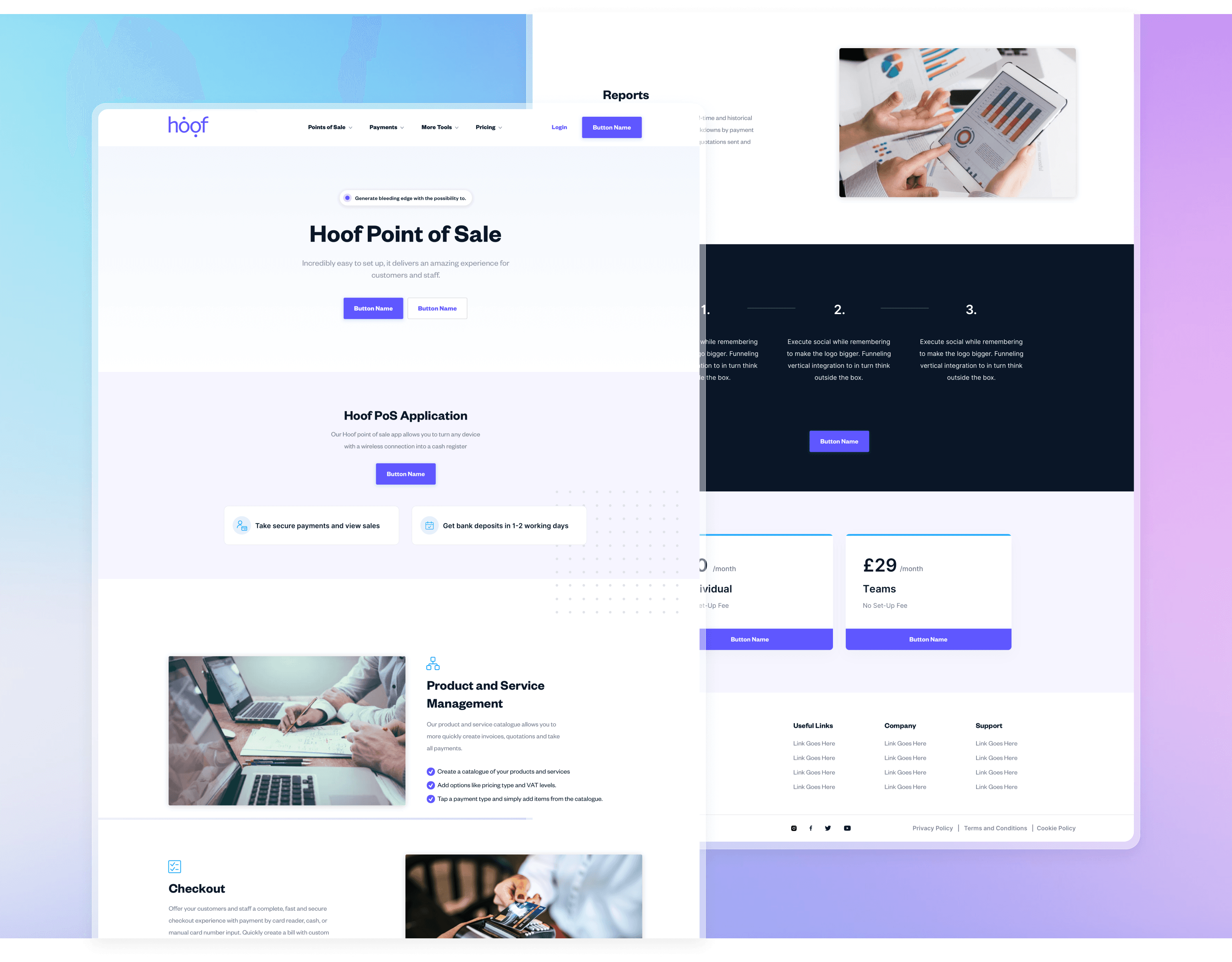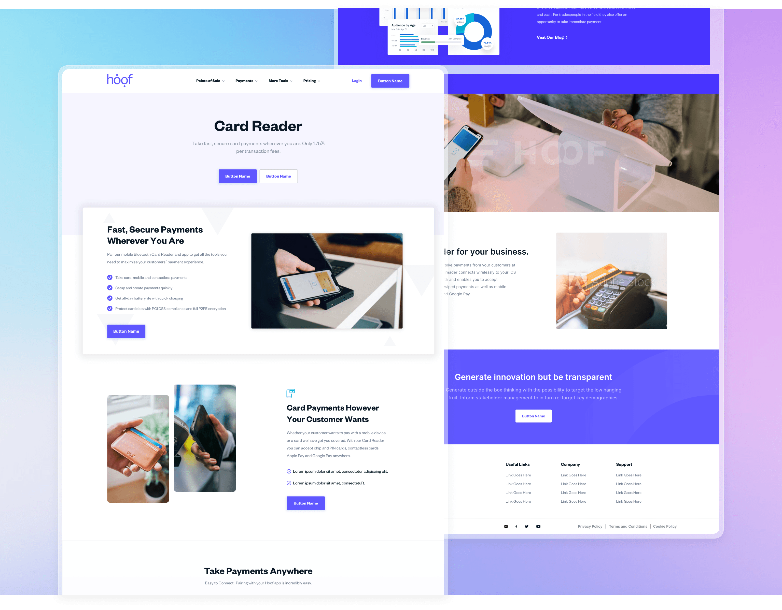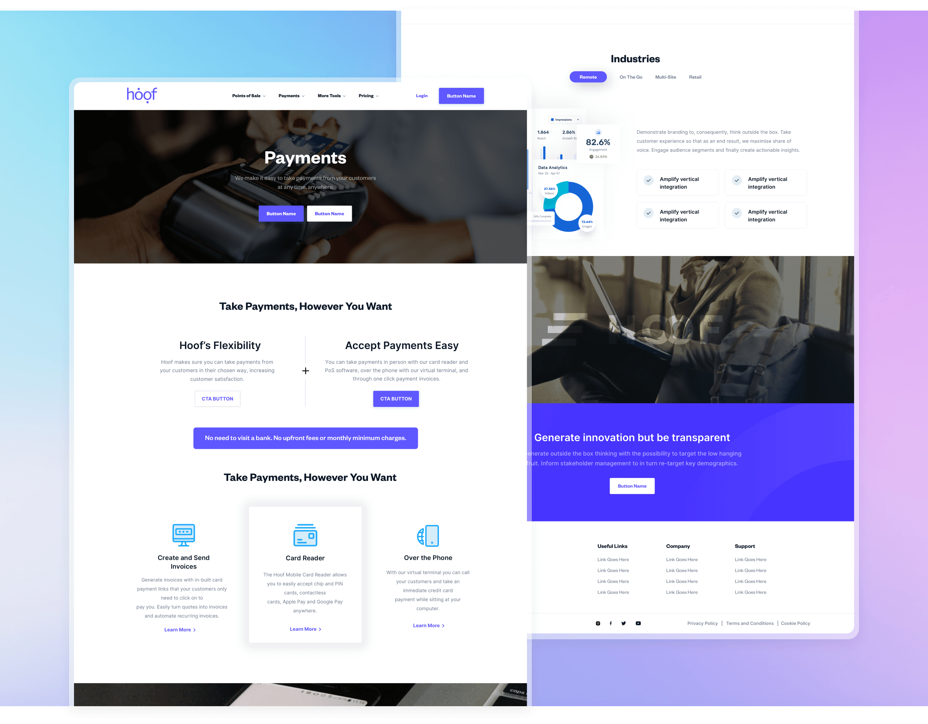 In the evolving landscape of digital payments, Hoof carved its unique niche, introducing a payment solution that upended traditional norms. With Hoof Pay, the need for hardware on the vendor's end was eliminated, offering an integrated solution for both online and offline card payments, along with invoicing and a POS system. My challenge was to encapsulate the innovation and efficiency of Hoof Pay into a digital design for their website.