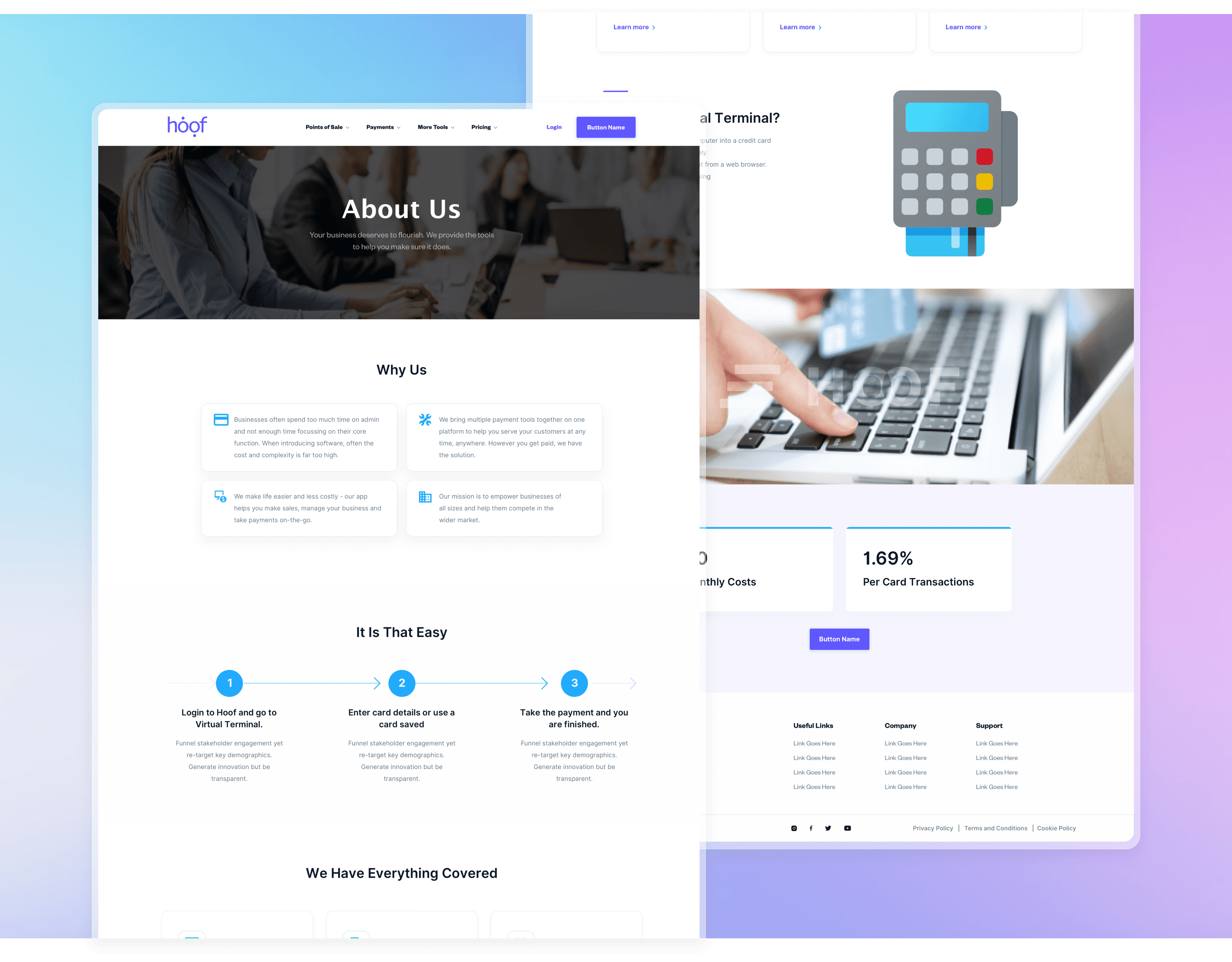The primary aim was to craft a website that echoed Hoof's ethos: simplicity, efficiency, and innovation. The homepage was designed to immediately introduce visitors to Hoof Pay's standout features - no hardware required, integrated invoicing, and a universal POS system. Clear visuals accompanied by concise descriptions aimed to convey the platform’s benefits at a glance. To cater to vendors who might be new to such a solution, educational resources, FAQs, and user testimonials were seamlessly woven into the design, ensuring potential users had access to all the information they needed to make an informed decision.