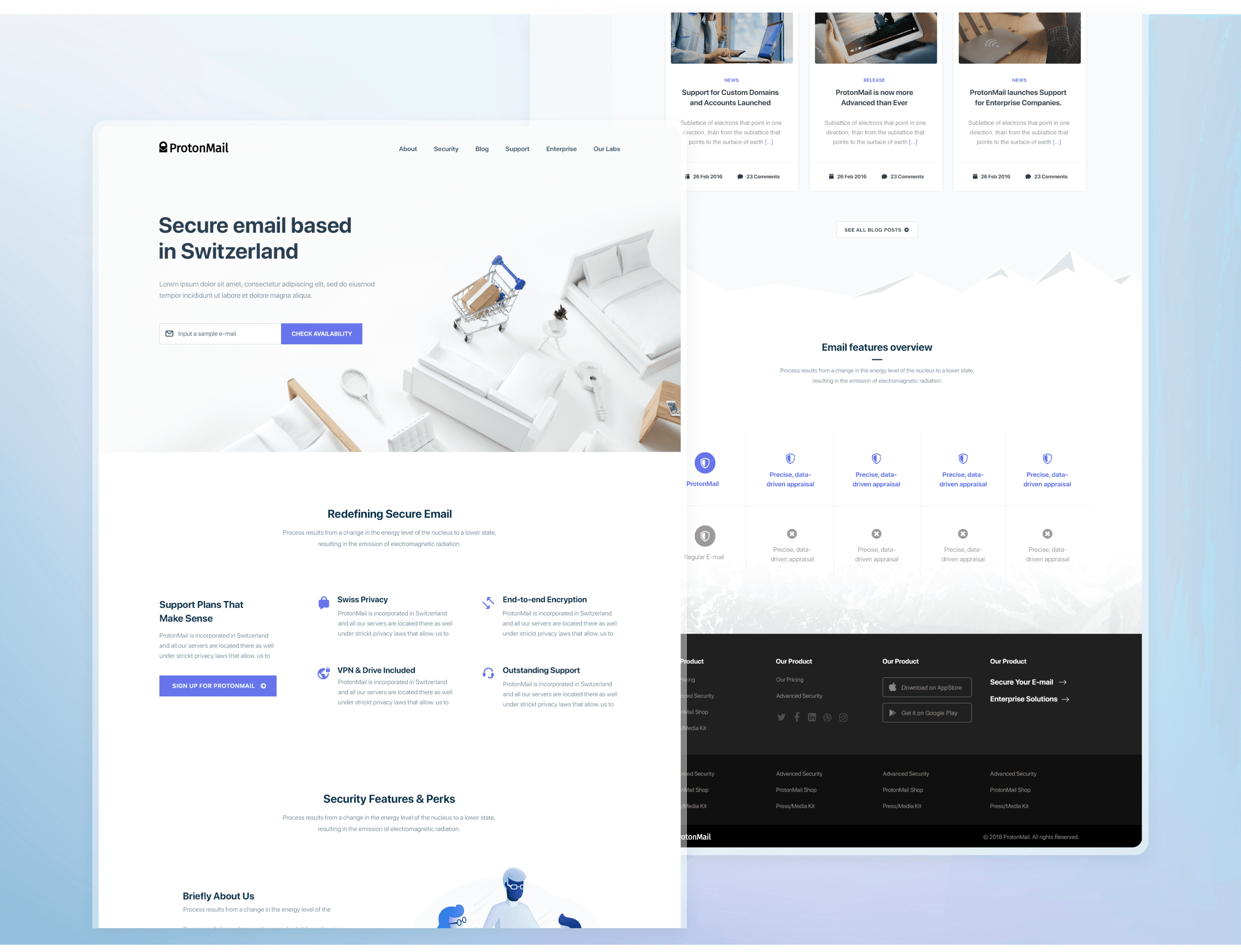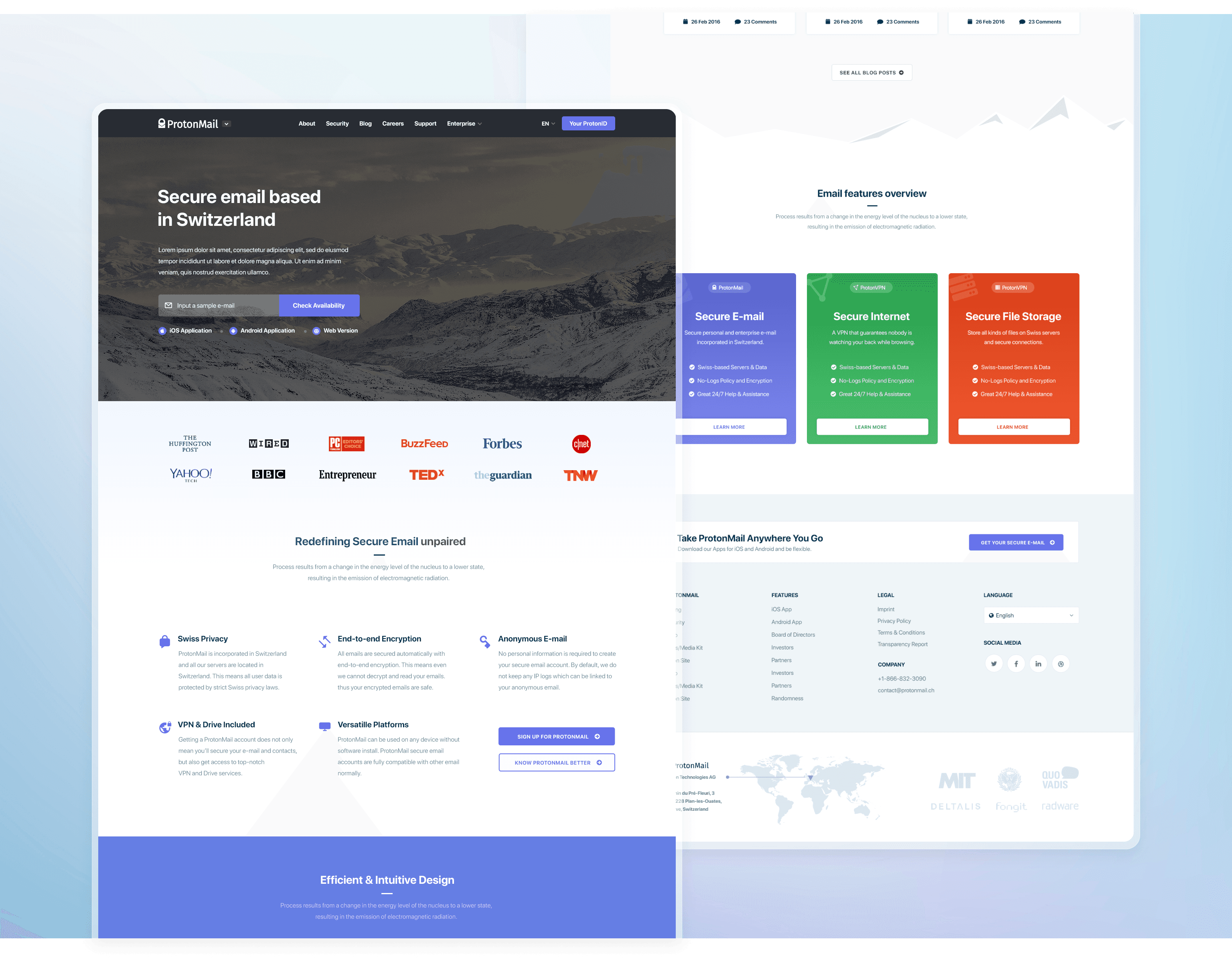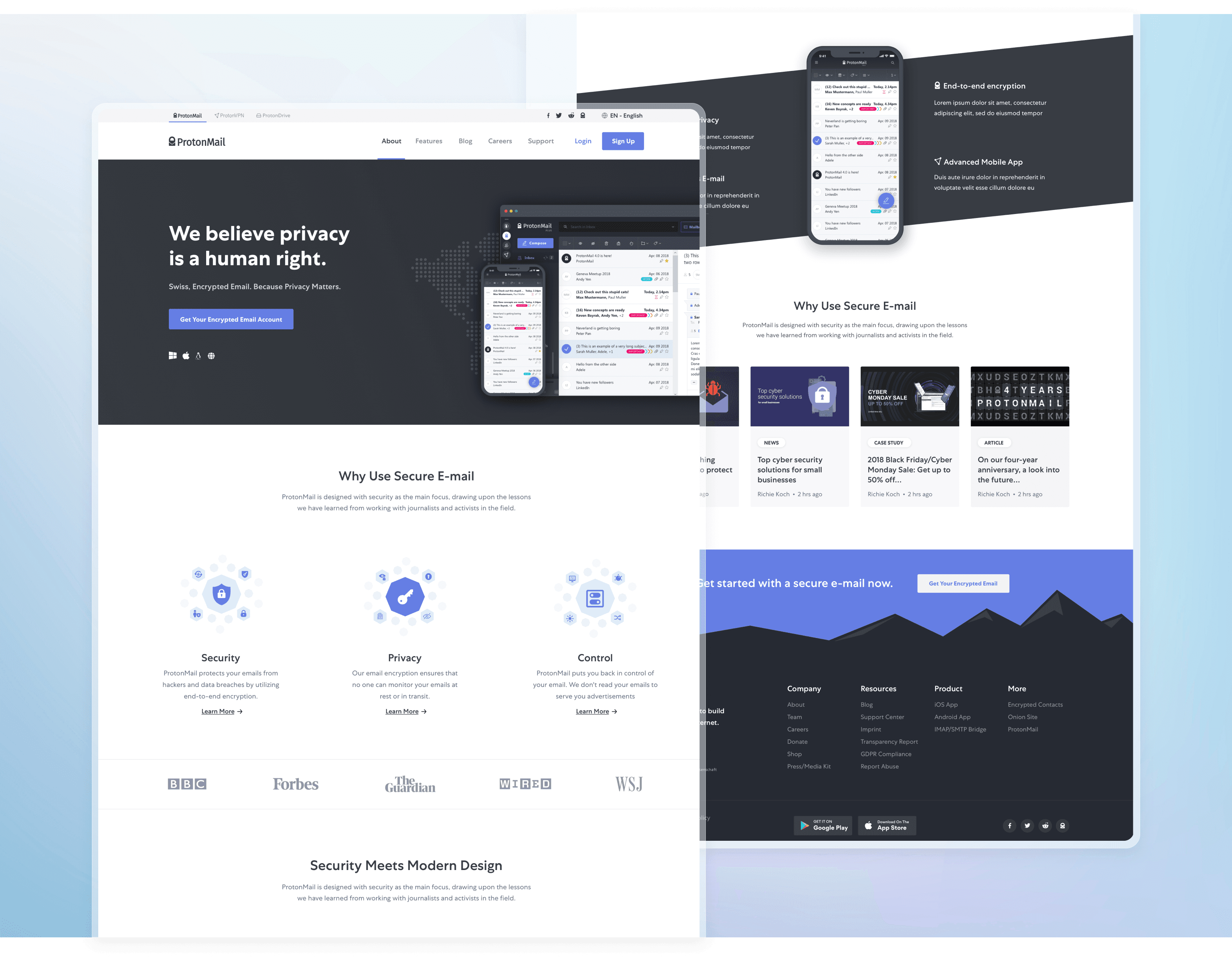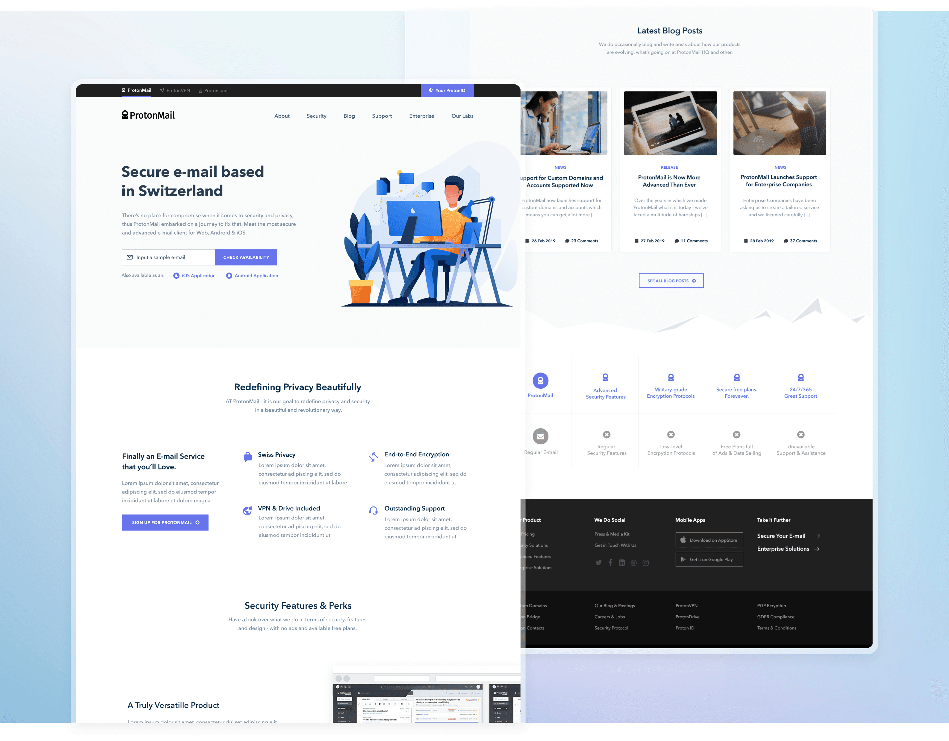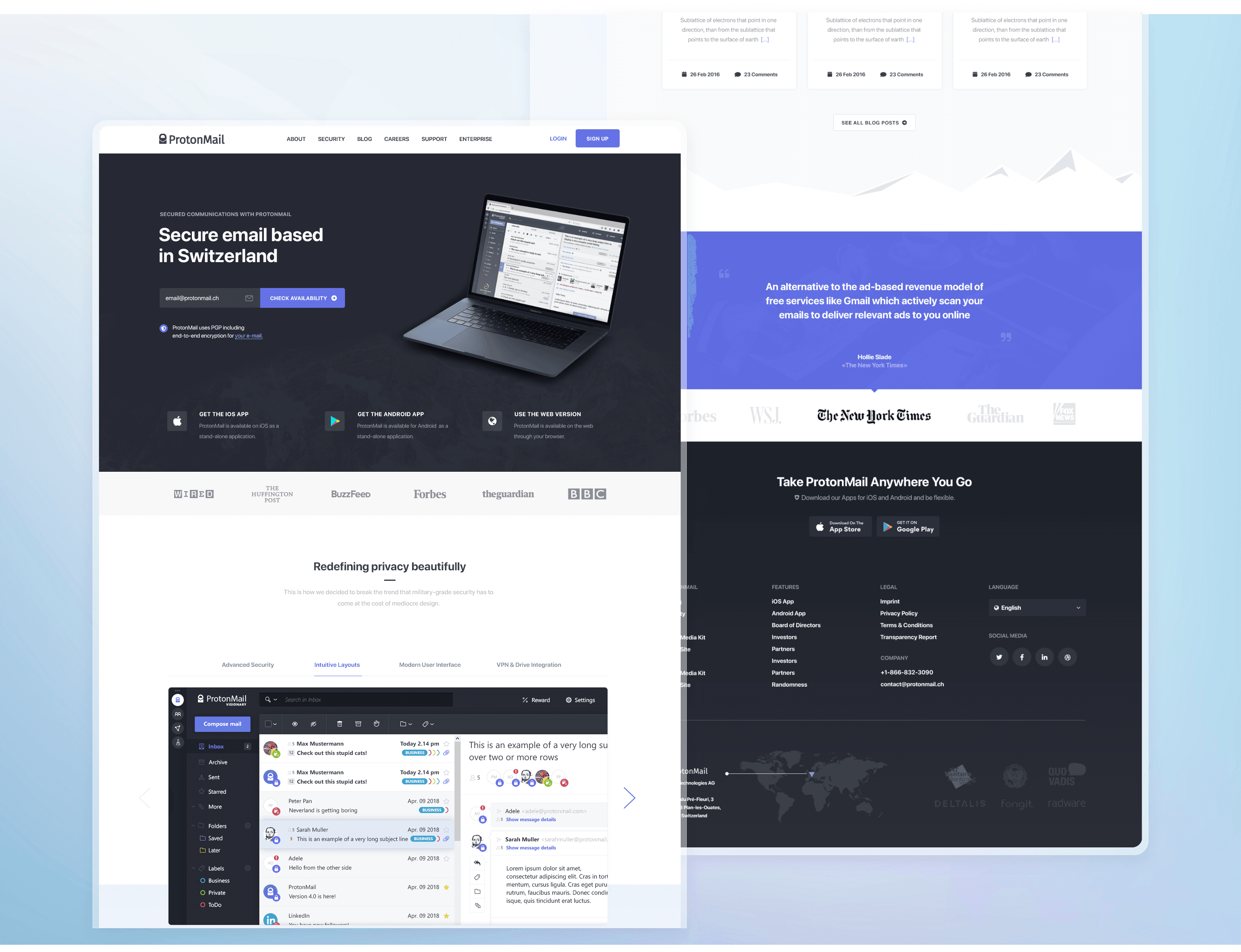 Moreover, given ProtonMail’s global user base, care was taken to ensure that the website’s design was universally intuitive, transcending linguistic and cultural boundaries. With design drafts in tow, prototypes were developed, acting as a bridge between design concepts and tangible user experiences. These prototypes were frequently shared within the ProtonMail team. Their insights, stemming from diverse departments, from engineering to marketing, enriched the design process, ensuring it was aligned with ProtonMail's overarching vision.