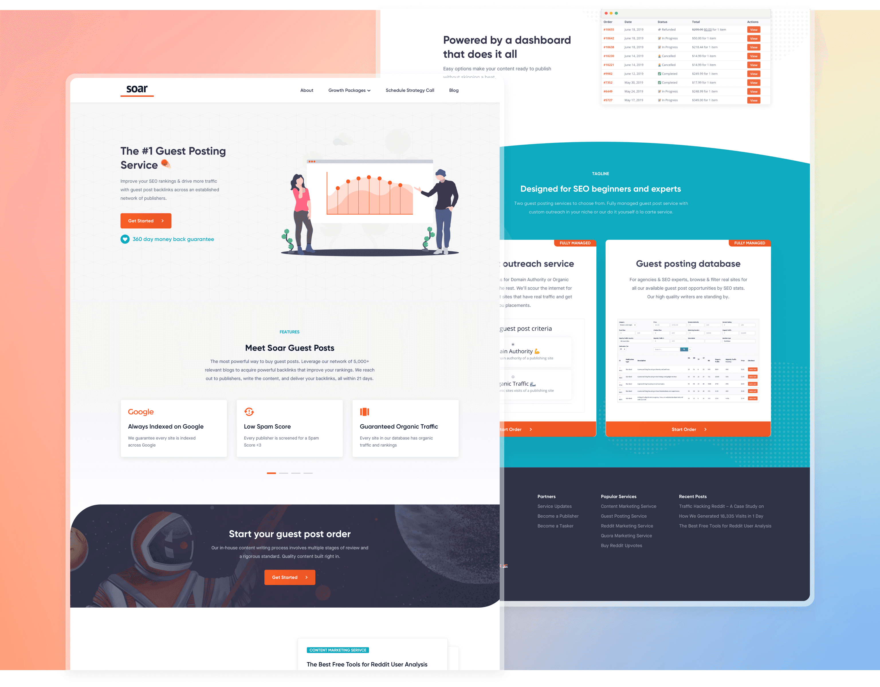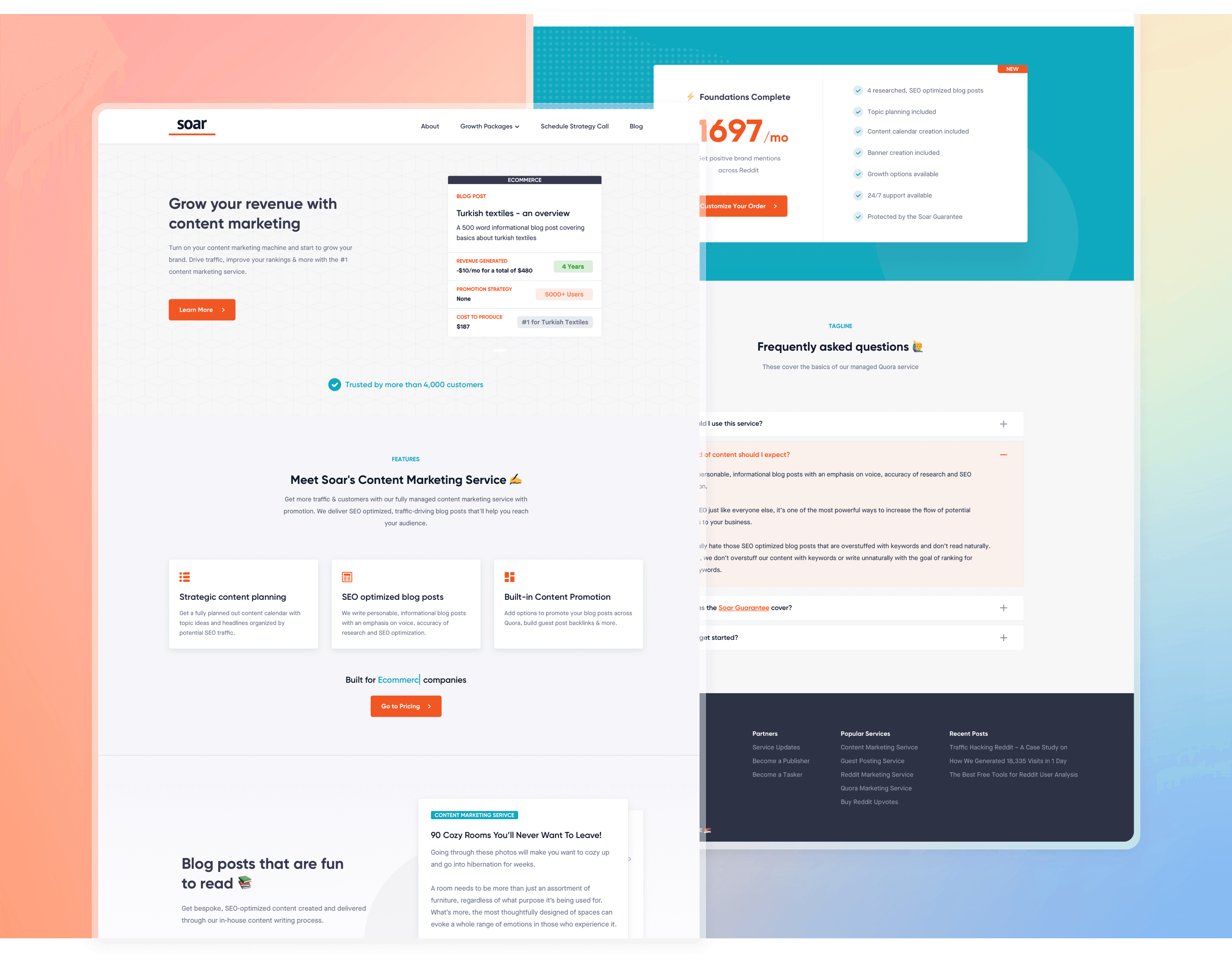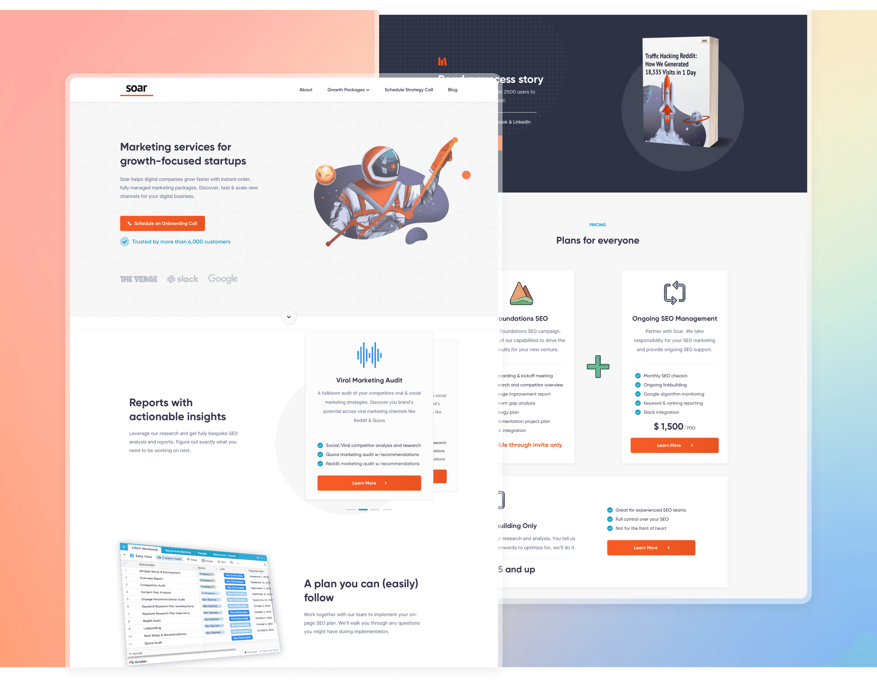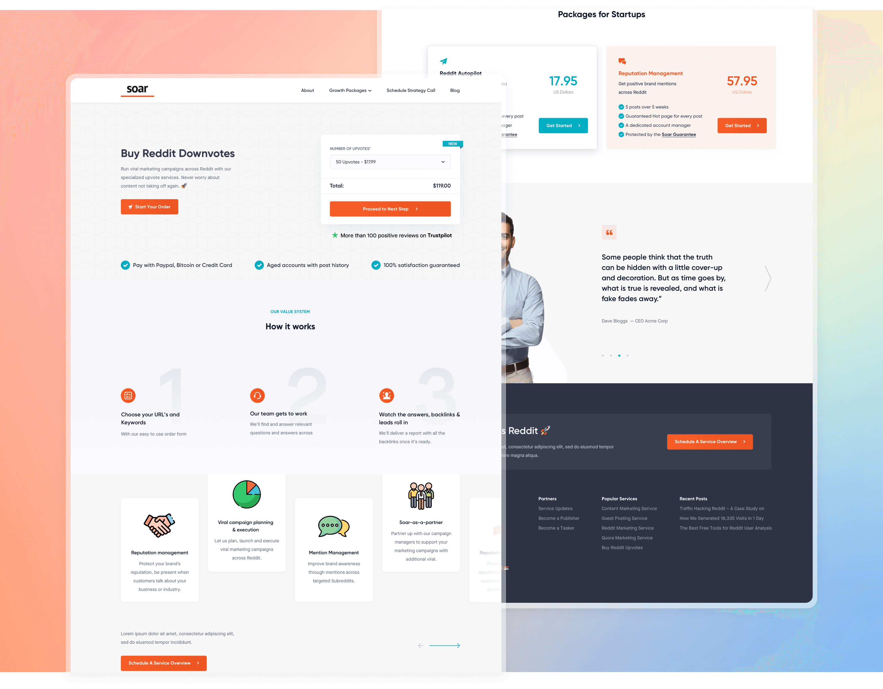 With audience insights in hand, the design for Soar.sh's website began to take shape. It was clear the site had to be more than informational; it needed to communicate trust, expertise, and a deep understanding of community platforms. The homepage was crafted to give an immediate overview of Soar's services, emphasizing their specialization in platforms like Reddit and Quora. Testimonials, case studies, and insights were weaved in, providing potential clients a glimpse into Soar's success stories and expertise.