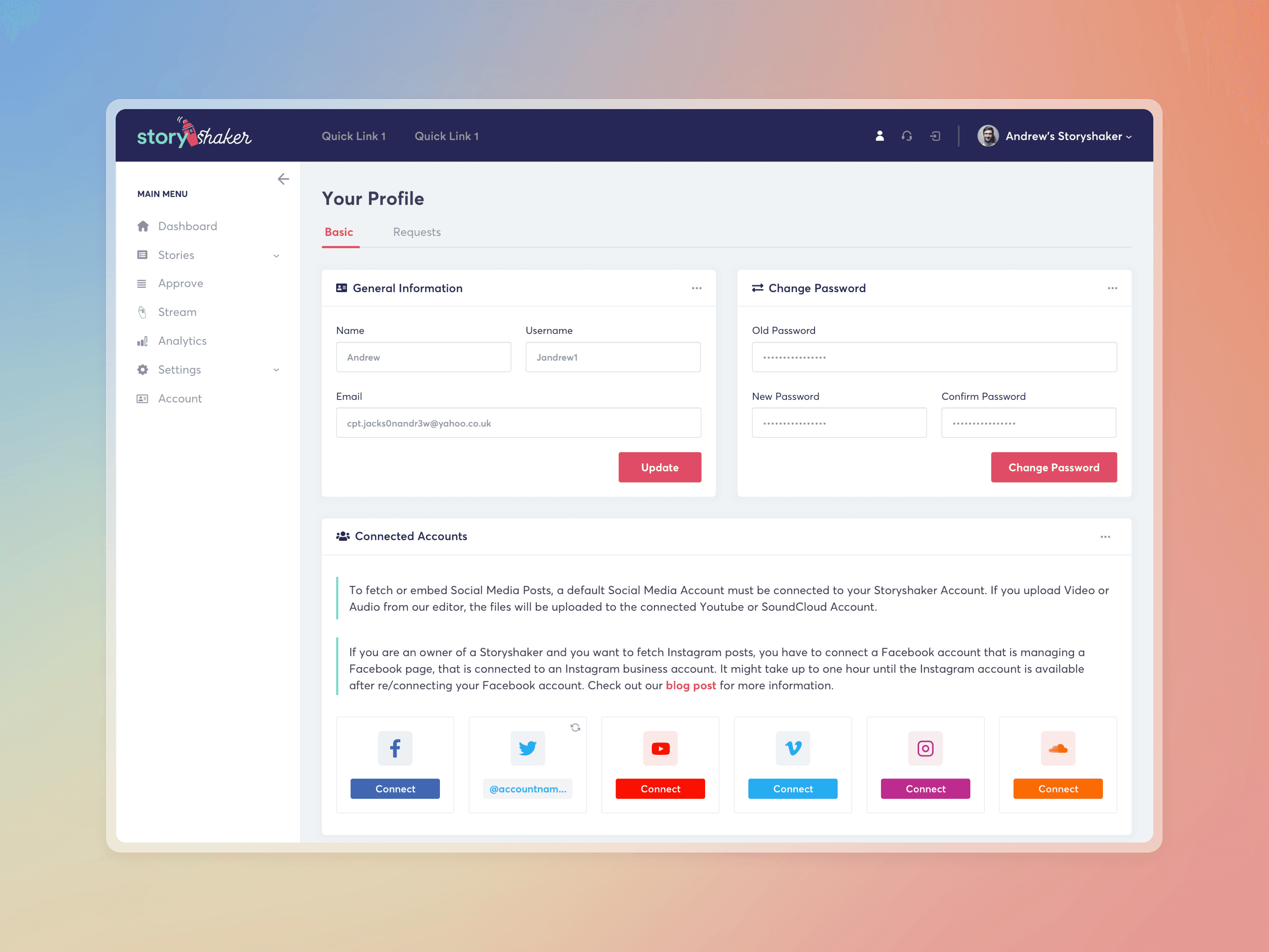 Storyshaker stepped into the digital landscape with a mission: simplify social media management for companies. By providing tools that streamline post scheduling, comment management, and performance insights, Storyshaker aimed to be the go-to platform for businesses looking to enhance their online presence. Central to achieving this goal was the creation of an intuitive and functional dashboard/web-application.